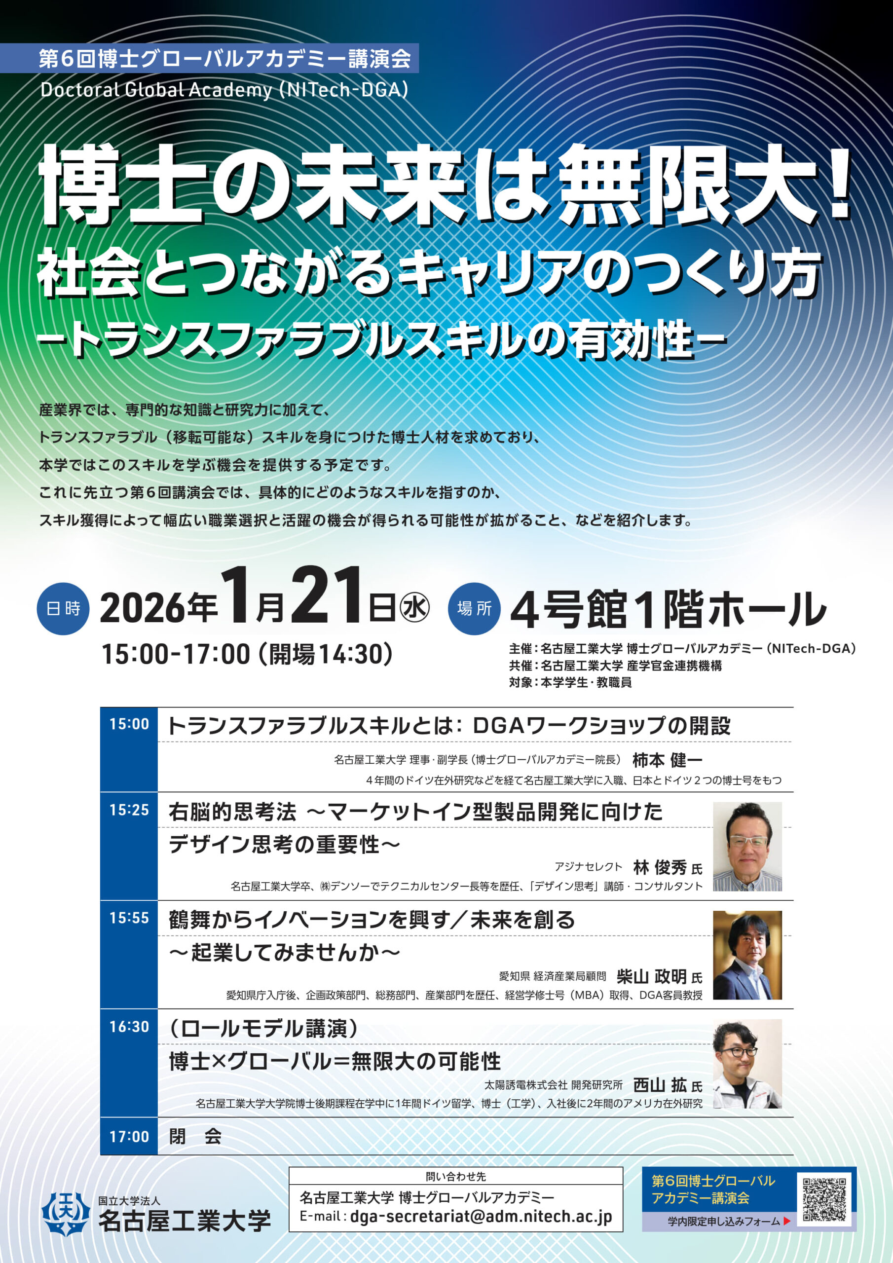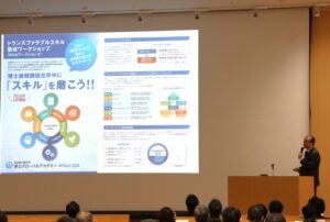 産業界では、専門的な知識と研究力に加え、ビジネス素養の一つとして「移転可能なスキル(トランスファラブルスキル)」を身につけた博士人材が求められています。本学においても、2026年4月より、トランスファブルスキル養成ワークショップ(DGAワークショップ)が新たに開設されることになりました。開設予定のDGAワークショップの事前説明会を兼ねた第6回 博士グローバルアカデミー講演会が、2026年1月21日に、4号館ホールで開催されました。ワークショップ対象の博士後期課程学生だけでなく、学部、修士の学生、教職員ら総勢100名を超える参加者が聴講しました。まず、理事・副学長 柿本健一院長から「DGAワークショップ」の紹介がありました。全6スキルを合格すると発行されるオープンバッジと修得証明書が、博士学生の就職活動に有効な武器になると期待されます。