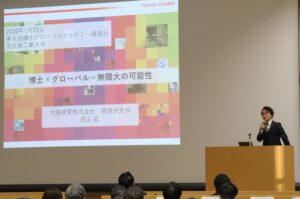 最後に名古屋工業大学博士後期課程で学位を取得された太陽誘電株式会社 開発研究所の西山 拡氏からロールモデル講演「博士×グローバル=無限大の可能性」がありました。学生時代のドイツへの留学、社会人になってからの米国在外研究経験に基づく、博士後期課程進学に対するお考えを述べられ、聴講する学生の背中を押していただけたように思います。